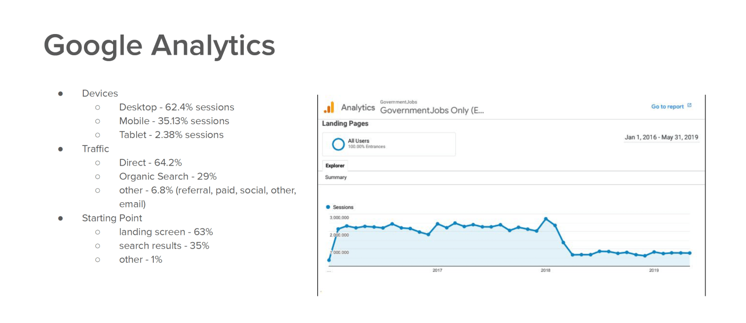 I collected data on site usage from Google Analytics, reports on applicant support cases from Salesforce, and utilized recently published research findings shared in NEOGOV’s Job Seeker Report.